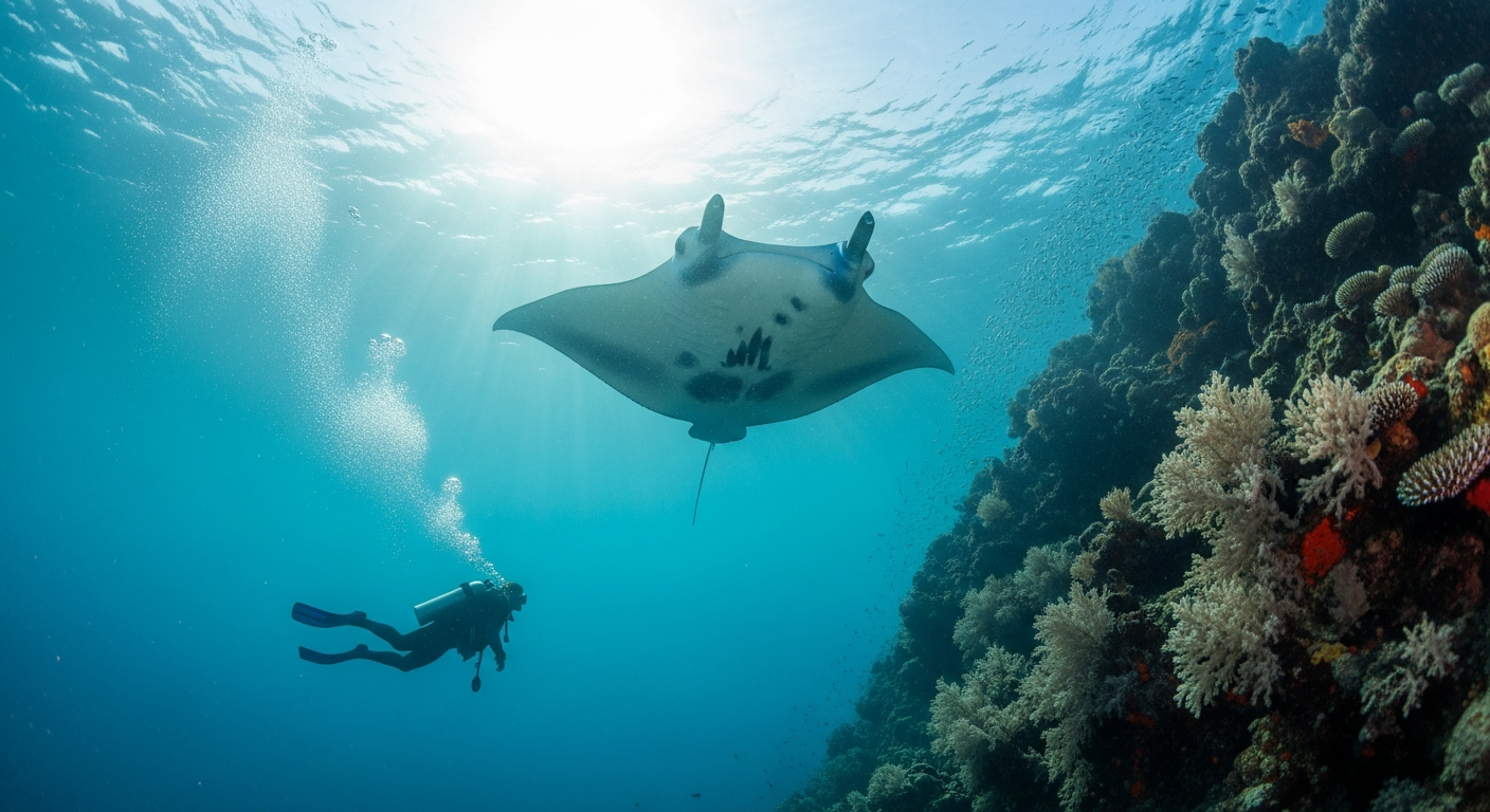 Cleaning station + sandy plateau. You don't dive deep here (10–15m); you hover and watch mantas glide past at touching distance. Timing is everything — slack tide or incoming. Wrong tide and it's a featureless sand patch. Good captains check the tide chart unprompted.